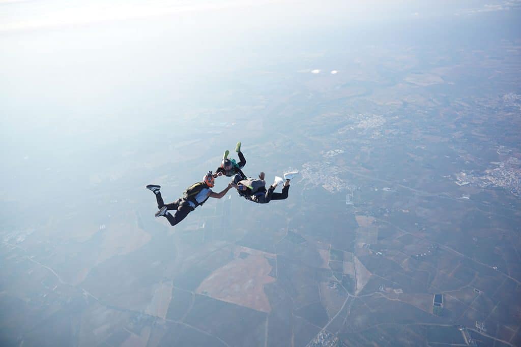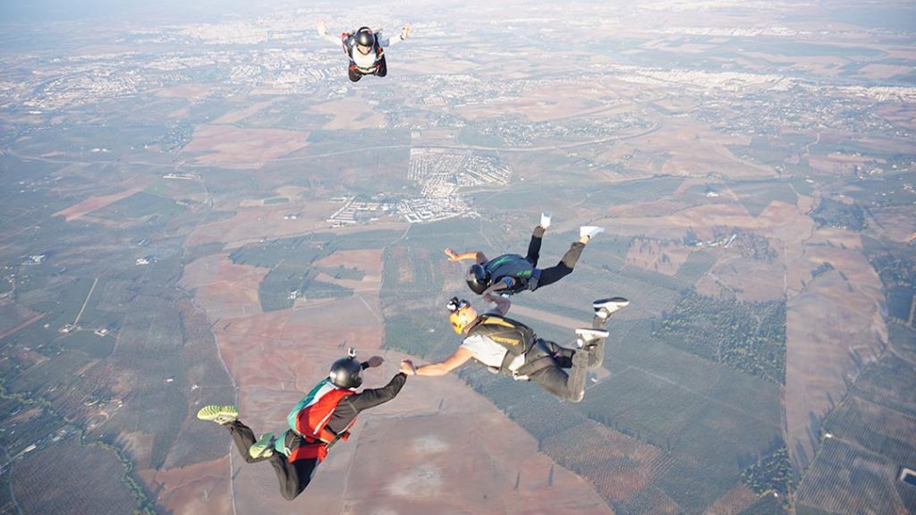 FS: El paracaidismo de formación es el arte de volar en el que dos o más personas se enlazan en caída libre, llevando a cabo una serie de “grips” y puntos.